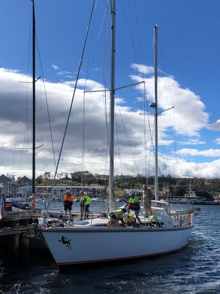 Well today was a great day, the rigging is back on LaGecko and she’s a ketch again