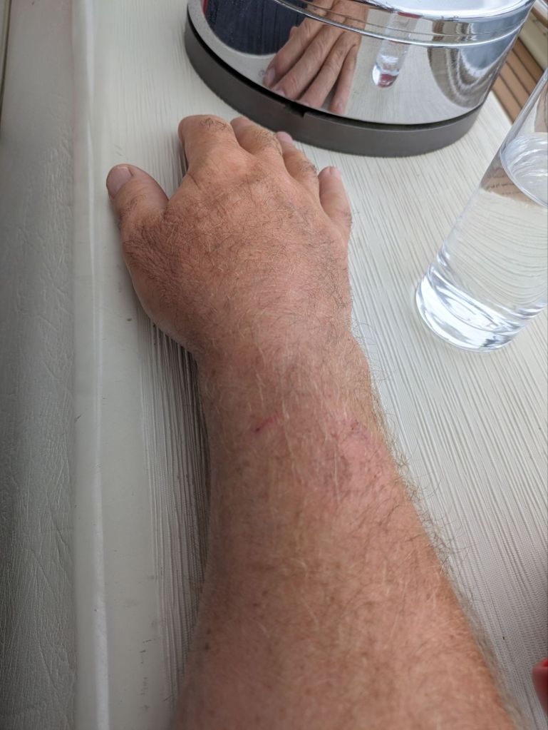 We cold packed my arm and hand, a few Panadol and a tough night trying to get comfortable, trying to find a position to sleep in that didn’t hurt, the next day is a lot less pain but a hand and arm that is not very useful as I can barely pickup a glass of water.