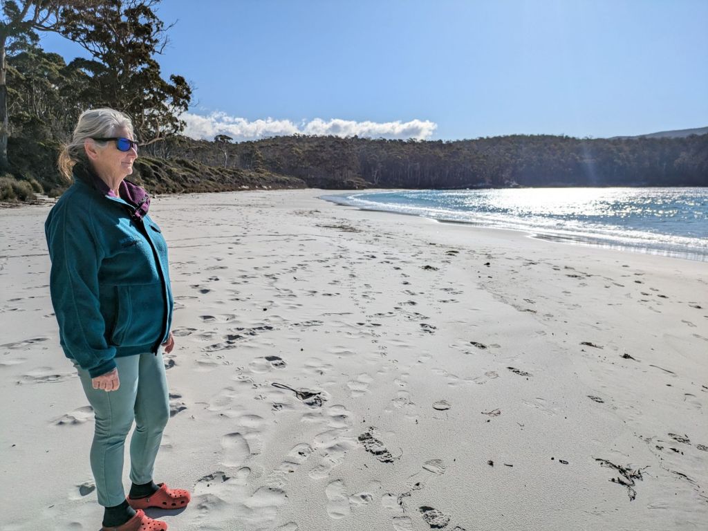 The day was beautiful with the sun shining and a warm 18ยฐ so we took the dinghy for a loop around Fortescue bay. We also tied up to the jetty near the beach and took a walk along the beach to stretch our legs.