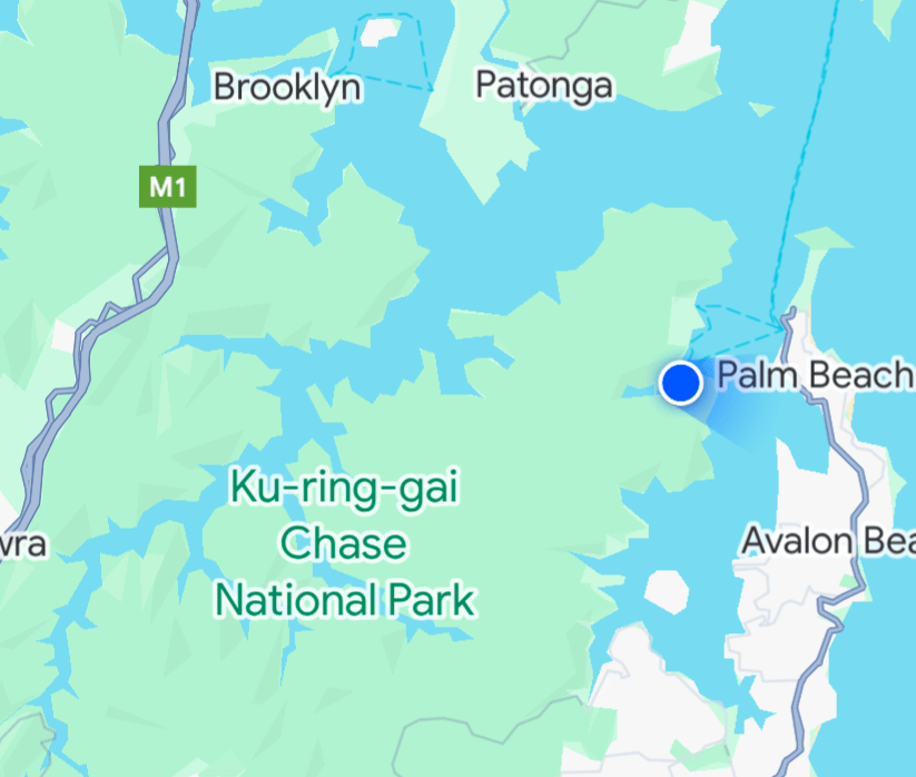 Pittwater (right side), Cowan Creek (bottom left and up to centre) and Hawksberry river (centre top)